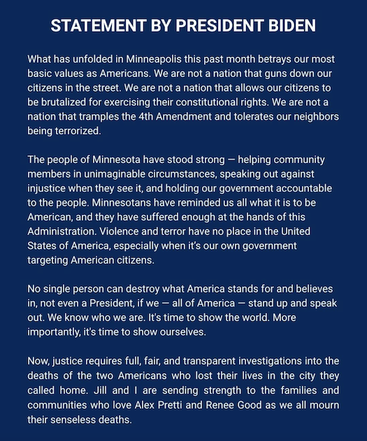 Biden concluded by calling for “full, fair, and transparent investigations” into both deaths, emphasizing that justice requires accountability even—or especially—when the state itself is responsible.