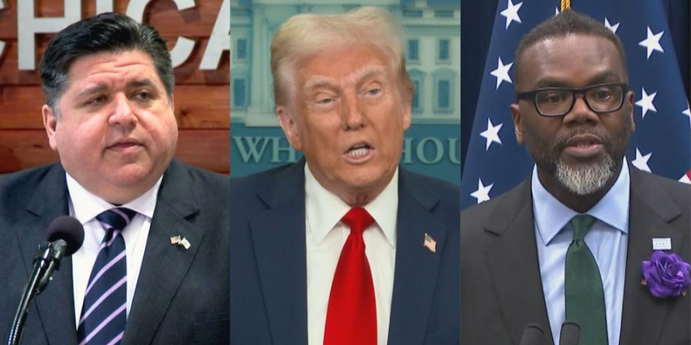 Illinois Gov. J.B. Pritzker, President Donald Trump, and Chicago Mayor Brandon Johnson. Photo credit: file photos.
